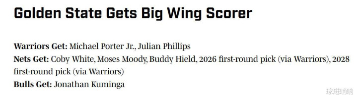 在这种情况下,美媒《SI》结合勇士队实际需求,以及目前曝出的各类消息,晒出一笔符合各队需求的潜在3方交易方案,具体方案如下: