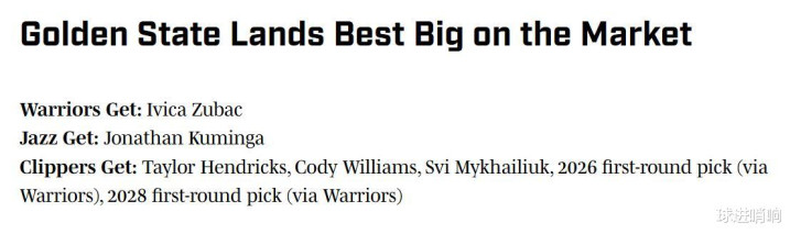 快船得到:亨德里克斯+科迪-威廉姆斯+米哈伊柳克+26年勇士首轮+28年勇士首轮。