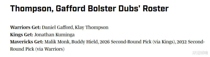 独行侠得到:蒙克+穆迪+国王26年二轮+勇士32年二轮。