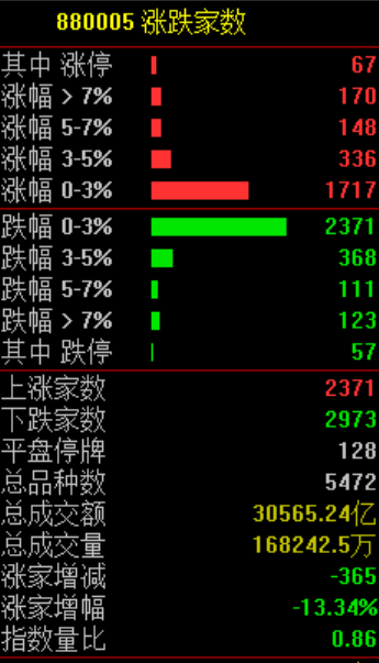 市场共2371只个股上涨,67只个股涨停,2973只个股下跌。