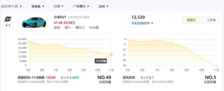 最后,全新小鹏P7实际所对标的车型是小米的SU7,但从11月销量数据上来看,小米SU7卖了12520辆新车,而小鹏P7却只有2882辆新车的销量成绩进账。所以如此看来,小鹏P7作为追赶者的步伐还差得很远呐。那文章到这我也就想问问大家:你们觉得全新小鹏P7为啥销量下滑呢?是因为外观过于吸睛、还是它哪里有什么硬伤?不妨在评论区里留言说说,咱们一起来交流探讨下。(文/优视汽车 大卓 )